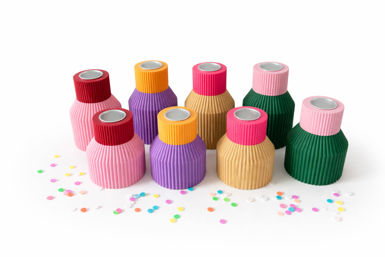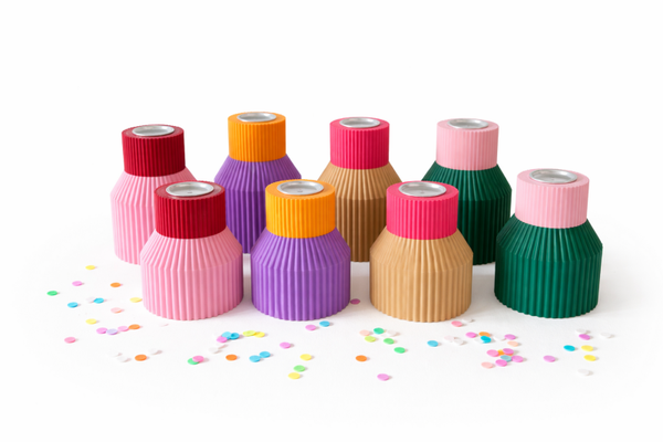 Twee formaten (groot 8,5 cm hoog en klein 6,5 cm hoog). Verkrijgbaar in 4 kleuren combinaties. roze-rood, paars-oranje, beige-neon roze, groen-roze
