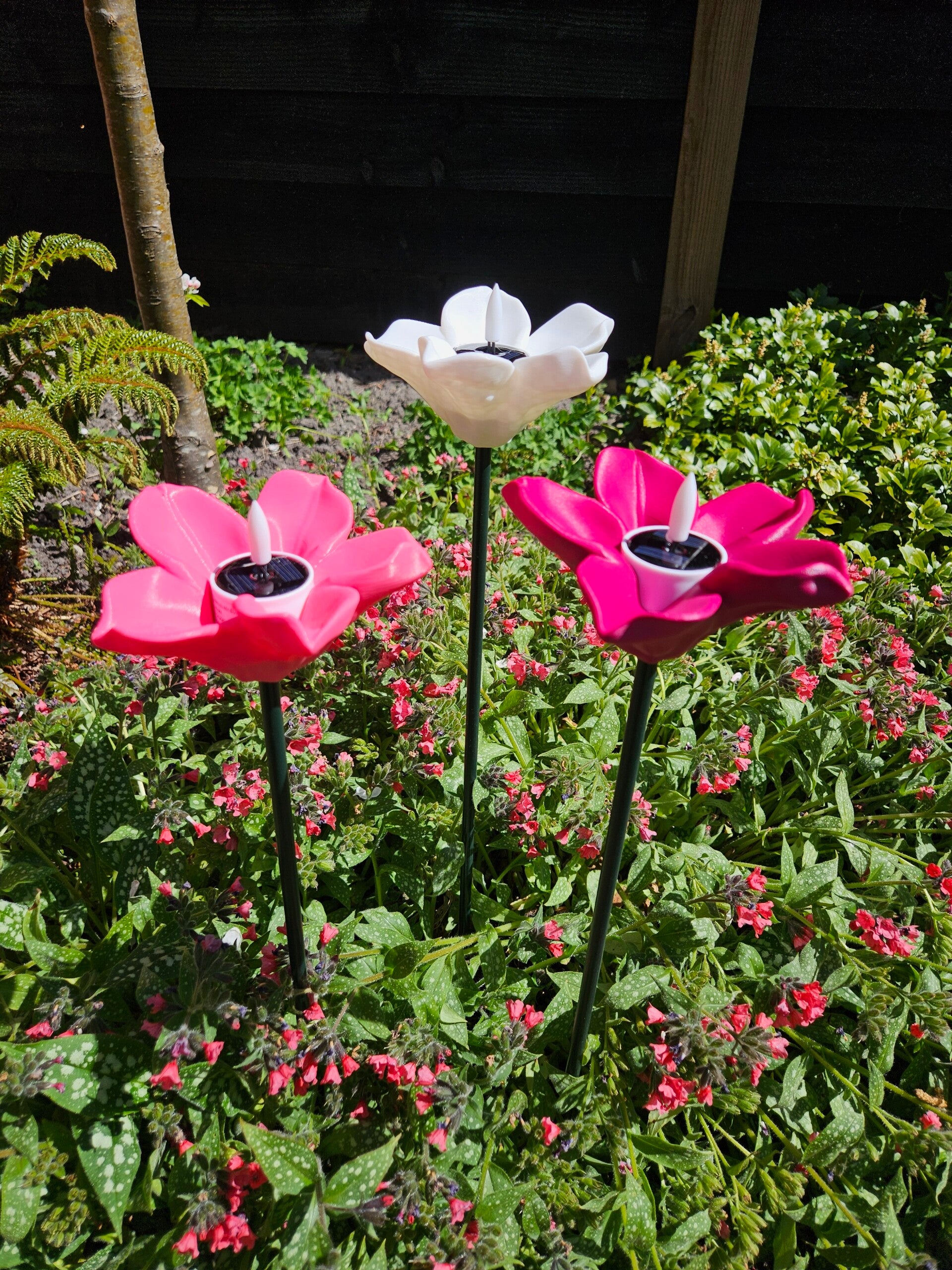 Een sierlijke 3D geprinte bloem met in het hart een solar lichtje.
